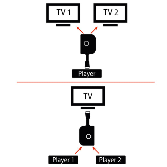 Der SW211 ist ein Bi-direktionaler HDMI-Verteiler und ist mit einem integrierten HDMI-Kabel ausgestattet. Schließe entweder zwei Quellen wie beispielweise eine PlayStation 5 und eine Xbox Series X an einem Display (2 In 1 Out) oder verbinde zwei Displays an einer HDMI-Quelle (1 In 2 Out). Beachte, dass beim Anschluss an zwei Displays nur ein Display das Bild anzeigen kann.