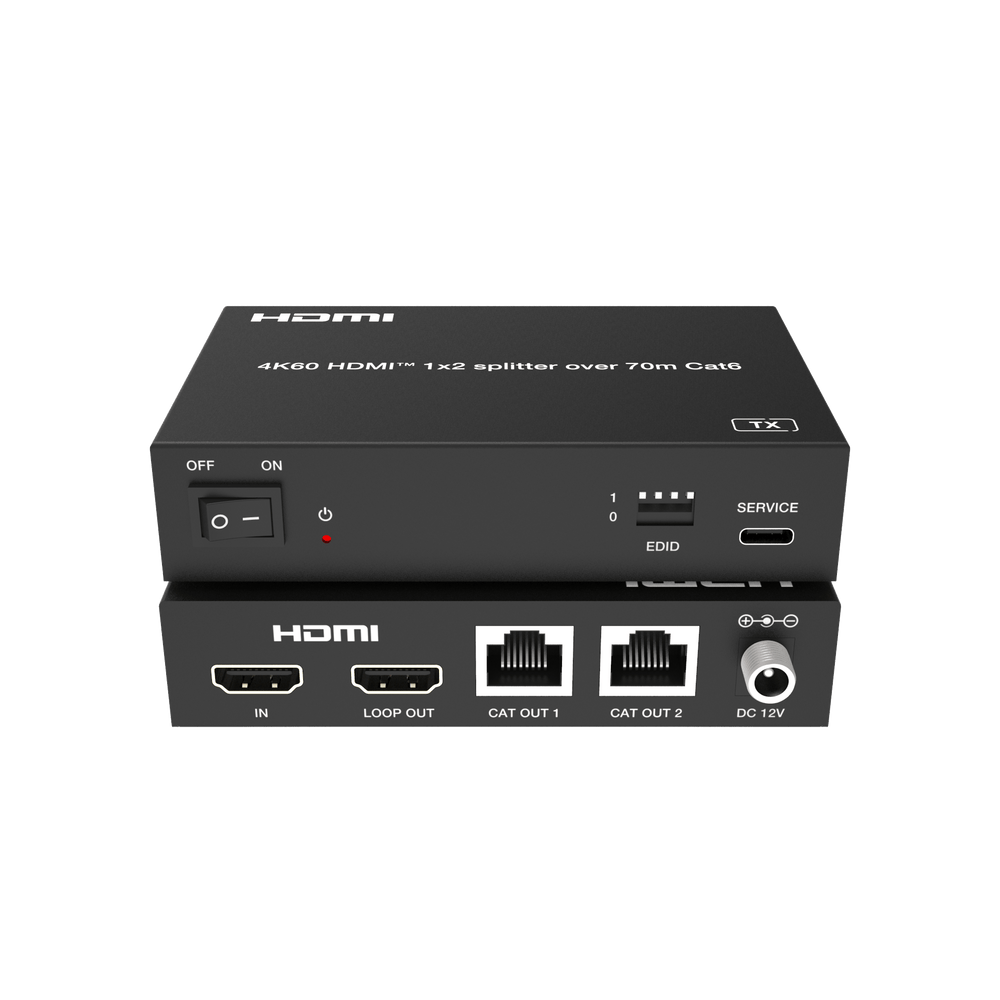• Ausgänge: 1× HDMI (Loop-Out am Transmitter), 2× RJ45 (CAT6/7 zu Receivern)