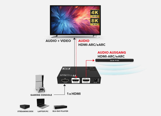Thanks to ARC (Audio Return Channel) support, the AX310 enables seamless audio transmission from your TV to the connected soundbar. Simply connect the AX310 to your display's HDMI-ARC or HDMI-eARC port and activate the eARC function. The AX310 automatically detects whether the audio is coming from the connected source or the TV, ensuring effortless switching. This feature enhances your home theater experience by providing a simple connection between your TV and the soundbar while delivering high-quality audio output. Whether you're streaming movies or playing games, you'll always get the best sound. It's also possible to connect a monitor or video projector without ARC and leave eARC disabled, giving you flexibility in your device selection.