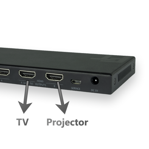 Please note that there is no CEC control function for players due to the distribution to 2 HDMI sinks. Switching between the players must therefore be carried out using the additional infrared remote control. The soundbar and players or displays do not turn on or off automatically. The volume control for the soundbar must be configured via infrared, e.g. using the universal control of the soundbar or remote control from the Apple TV, Fire TV Cube or similar. The soundbar volume can be controlled with the remote of a TV which is connected to Output A and has HDMI-ARC/eARC function. Or the respective app of the soundbar can be used.