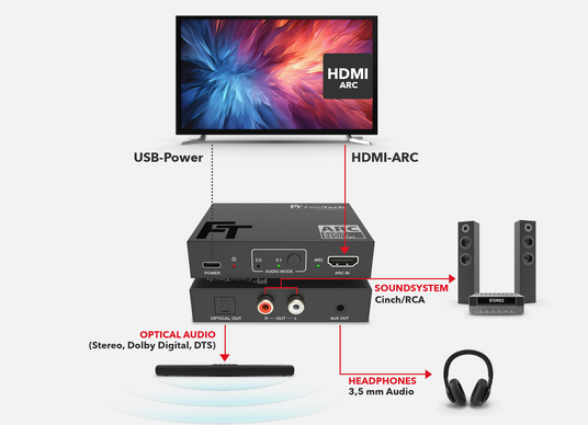 The AX130 is the ideal solution for conveniently routing your TV's audio to external audio devices – simply via your TV's HDMI-ARC or HDMI-eARC port. Whether it's a home theater system, headphones, or speakers – the AX130 ensures flexible sound enjoyment. The AX130 was developed with the latest generation of TVs in mind, which often lack traditional audio outputs and only offer HDMI-ARC or HDMI-eARC.