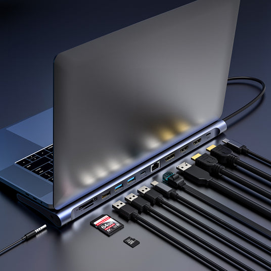 The docking station offers two USB 3.0 ports, one USB-C port (data only), one USB 2.0 port, a 3.5 mm stereo audio output, as well as Gigabit Ethernet, SD, and TF card slots. All connections are plug and play, requiring no additional software installation.