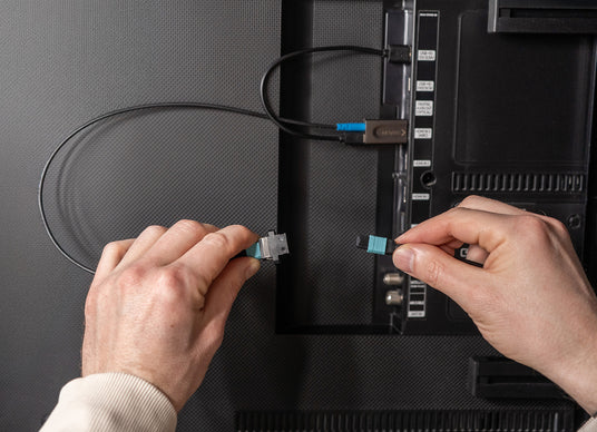 First, the short MPO connectors, which are permanently attached to the HDMI plugs, are inserted into the respective MPO adapters. Ensure the correct orientation of the connector tab – an audible click confirms proper locking. Next, the long MPO fiber optic cable is connected to the available adapter ports until the locking mechanism engages. Avoid touching the fiber optic contact surfaces to prevent contamination. Remove the protective caps immediately before connecting and replace them after disconnecting.